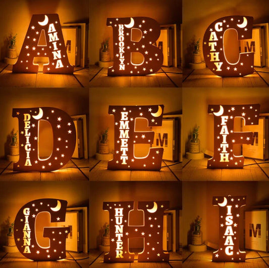lampada personalizzata con stelle Nome dell'alfabeto in legno personalizzato, segno delle lettere / lampada da comodino, decorazione