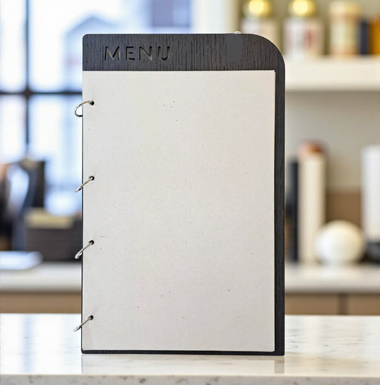 Porta menù in legno nero simil ebano formato A4/A5 per HoReCa (Hotel, Ristoranti, Bar), Porta menù personalizzato, Porta menù inciso con anelli, Menù con logo