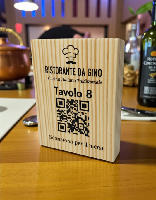 qr code da tavolo versione economica Portamenu 10-50-100 pz in legno naturale, personalizzati con incisione laser logo ristorante economico