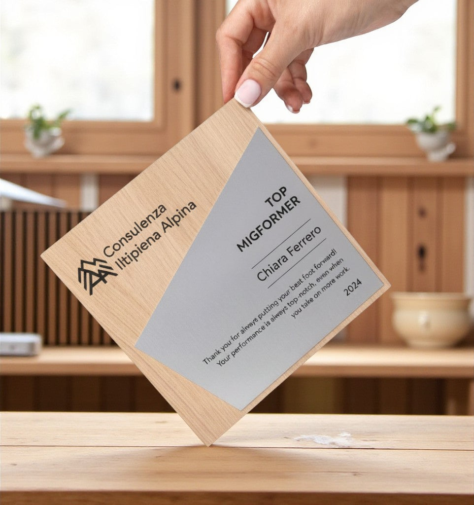 Un trofeo elegante e unico, realizzato in legno compensato verniciato e rifinito con flexibrass (oro, argento o bronzo), inciso al laser con il tuo logo e/o messaggio personalizzato.